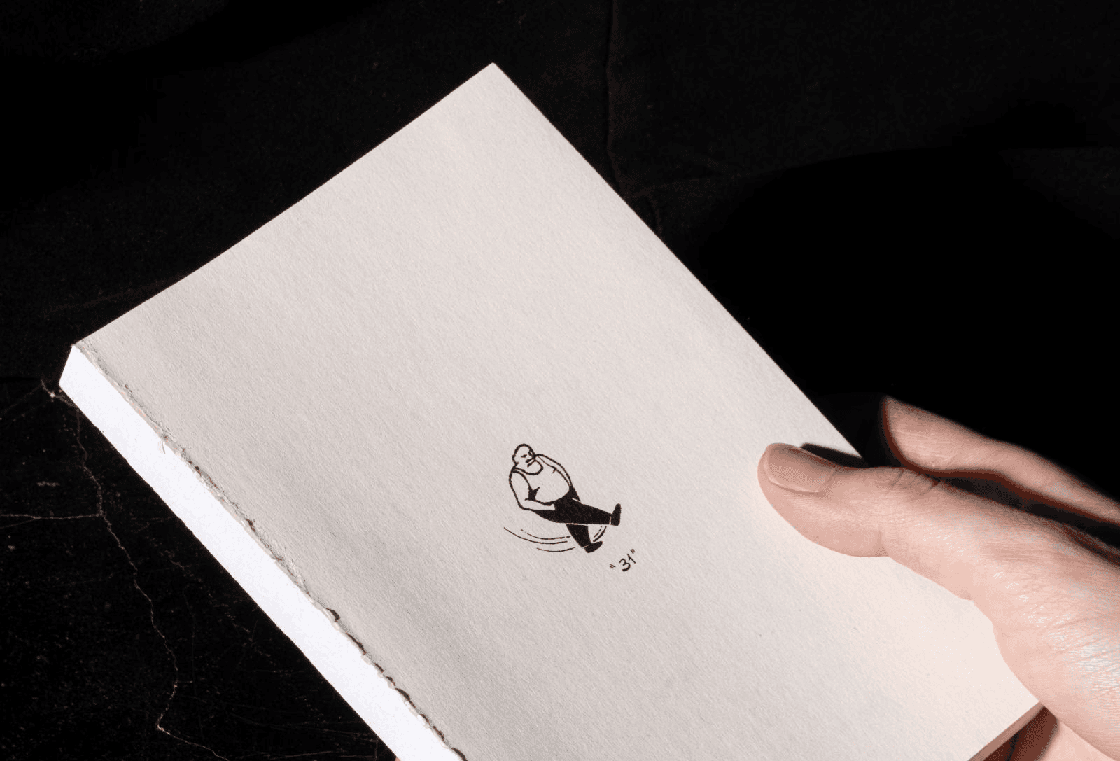 The book features a fragile, unbound cover that tears apart upon the first opening. This effect is intentional, conceived as a reflection of the author’s acknowledgement of impermanence. A single illustration on the front page is the only indication of the book’s title, which is shared with the chapter on page 31.